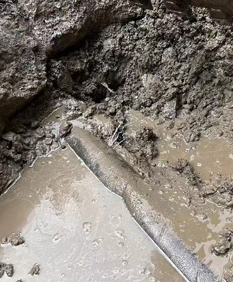 在過馬路的管道三通處裂縫。由于地基下沉,導致三通被拉裂漏水,水流隨著涵洞流入一處廢井,故地面及周圍污水井、電纜井均無水流流入。