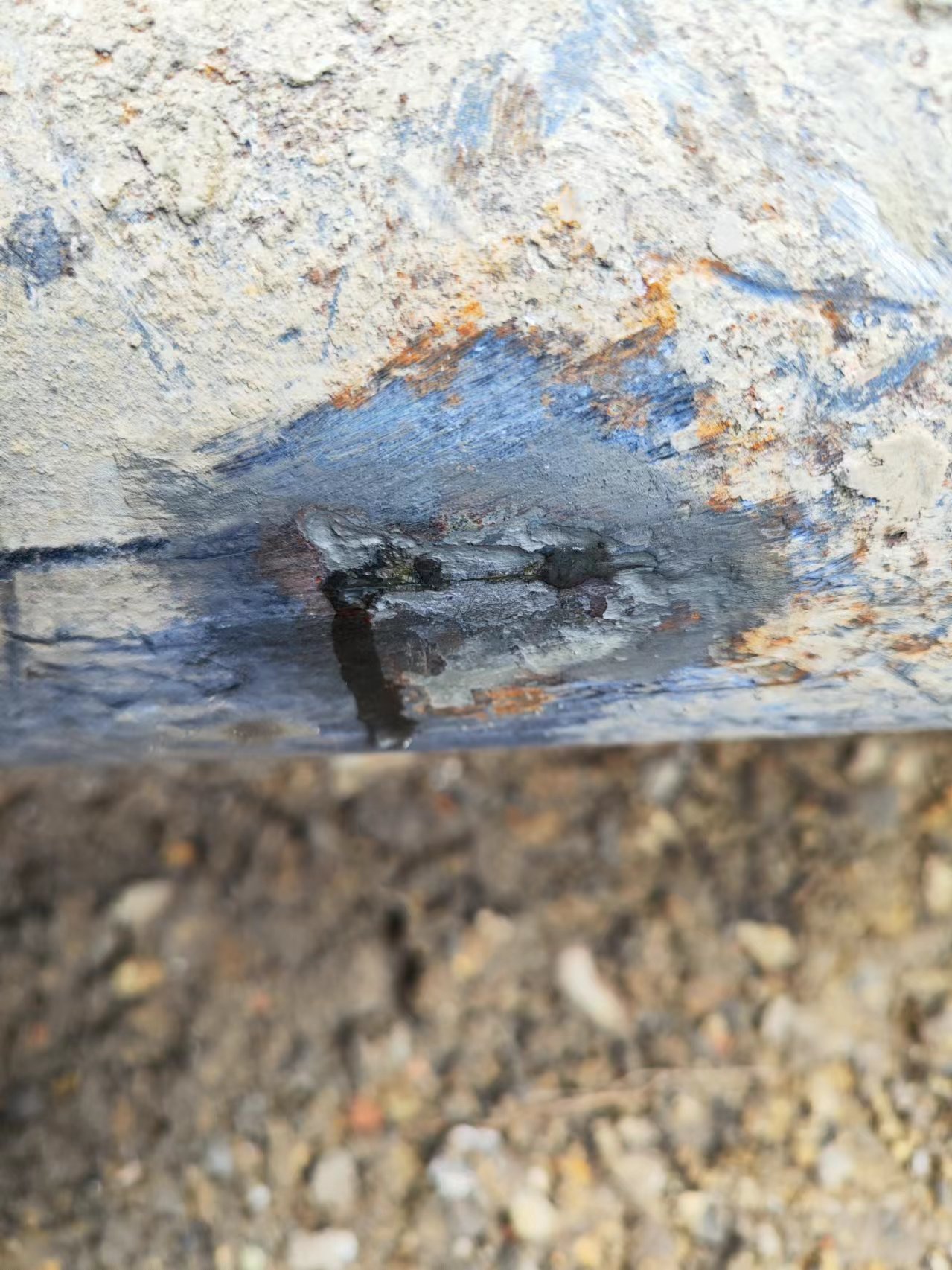 但是漏口周圍好多銹蝕將漏口覆蓋,導(dǎo)致漏孔并未見迸射的泄漏水線,從漏孔流出的水是從管道側(cè)面的泄漏口緩慢流淌到管道底部后滲流到地下。